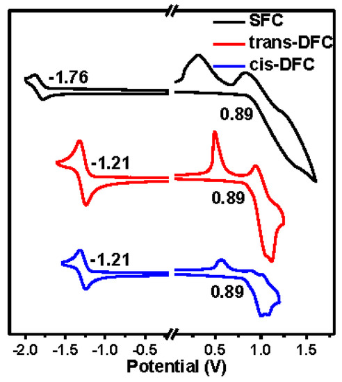 In the cyclic voltammetry measurement, the oxidation and reduction potentials of SFC were found to be at 0.89 V and −1.76 V against ferrocenium/ferrocene (fc+/fc) redox couple (Figure 6), corresponding to a HOMO level of −5.48 eV and a LUMO level of −2.97 eV, respectively. Similar HOMO and LUMO levels were both obtained for trans- and cis-DFC. Their HOMO levels were both calculated to be −5.48 eV, and the LUMO levels were both −3.51 eV. Their HOMO levels were the same as that of SFC, which were all determined by the carbazole units [25]. The introduction of an additional cyano group in DFC has induced a 0.54 eV decrease in LUMO energy level.