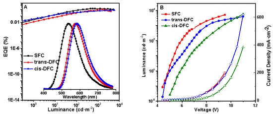 (A) EQE of SFC, trans-DFC, and cis-DFC and their normalized EL spectra; (B) Luminance–voltage–current density characteristics of multilayer EL devices of SFC, trans-DFC, and cis-DFC.