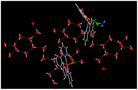 There are some weak intermolecular interactions between the anionic water cluster polymers [(H2O)18(OH)2]n2n and four crystallization water molecules with the distance of O7w∙∙O4w 3.295 Å. The crystallization water molecules O4w locate on the anionic water cluster layer, and O5w water molecules are between the host [CuCl(bipy)2]+ cations. The two-dimensional anionic water polymer layers along the (100) direction with extended one-dimensional supramolecular assembly of chloride-water cluster along the c axis intercross and form ladder-shaped structure (Supplementary Materials Figure S6).