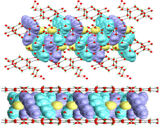 The anionic water cluster polymer [(H2O)18(OH)2]n2n−with the host [CuCl(bipy)2]+ cations form ionic bonds by electrostatic forces. The one-dimensional anionic water cluster polymers, [(H2O)18(OH)2]n2n−, alternate each other and form independent two-dimensional water layers running parallel to (100). The distances between the adjacent water layers is approximately 12.344 Å, with the shortest distance of two H atoms being 9.721 Å. The thickness of water layers is about 1.947 Å. Figure 3 shows the perspective view of the structurally two-dimensional anion water cluster layers, which is separated by the host [CuCl(bipy)2]+ cations, and form the host [CuCl(bipy)2]+ cations sandwiched between two nearly planar water cluster sheet. In addition, the Cu atoms in interlayer of the host [CuCl(bipy)2]+ cations are all in the same plane, with the distance of adjacent Cu(1)∙∙∙Cu(2) 5.531(1) Å, Cu(1)∙∙∙Cu(1) or Cu(2)∙∙∙Cu(2) 7.624 Å. The distance of Cu layer-layer is also 12.344 Å (Supplementary Materials Figure S5).