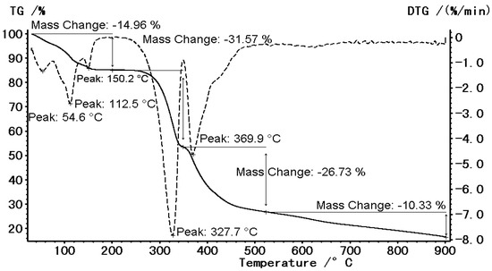 To get more insight into the properties relative to water cluster, the dehydration behavior of compound (1) has been investigated using thermogravimetric analysis. The TG and DTG curves of compound (1) are shown in Figure 4. The weight loss begins at 54.6 °C, and shows an obvious inflexion at about 150.2 °C. The first step corresponds to the loss of nine water molecules with three heat-absorption peaks (found 14.96% calc. 15.36%). From 150.2 °C to 267.5 °C, there is no weight loss to be observed, indicating the residue [CuCl(bipy)2]2[(OH)2] is very stable. At 327.7 °C, there is an intense endothermic phenomenon, the weight loss of 31.57% correspond to two bipy groups (calc. 29.58%). The residue is [CuCl]2(OH)2. At about 350 °C, there is a little inflexion, suggesting the residual compound [CuCl]2(OH)2 is stable. Upon the temperature increases, and there is weight-loss of (26.73% + 10.33%) suggesting the decomposing of [CuCl]2(OH)2. The final residual compound maybe is CuO (calc. 15.08%, Found 16.11%).