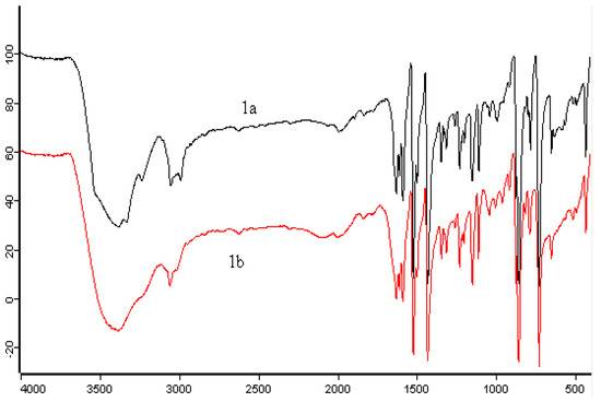 IR spectra of compound (1). (1a) The original crystalline samples; (1b) The residuum at 150.2 °C.