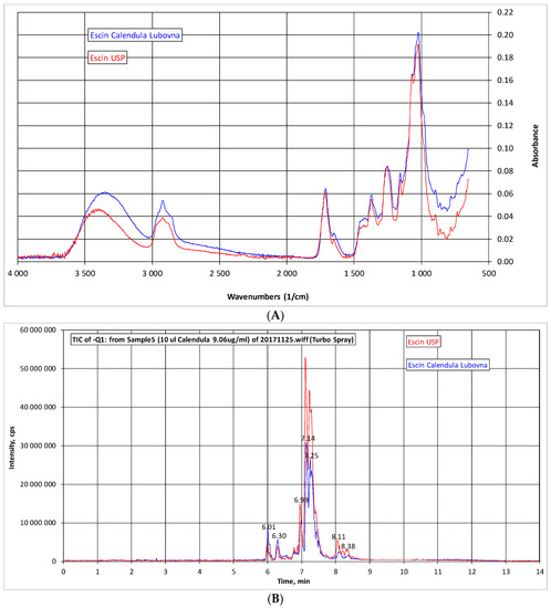 Analysis of β-escin. (A) Comparison of IR spectra of β-escin (Calendula, blue) and standard of β-escin (USP, red); (B) Comparison of HPLC-MS chromatogram of β-escin (Calendula, blue) and USP standard of β-escin (red).