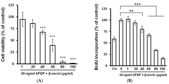 Effect of β-escin on HUVECs. (A) Inhibitory effect of β-escin on cell viability. HUVECs were treated with various concentrations of β-escin (1–100 µg/mL) in the presence of bFGF (30 ng/mL) for 48 h. Cell viability was measured by MTT assay as described in the Materials and Methods section. The results represent the mean values ± SD of three independent experiments; (B) Proliferation assay using quantitative ELISA analysis of BrdU incorporation into HUVECs during exposure to β-escin (1–100 µg/mL). Data are presented as means ± SD (** p < 0.01, *** p < 0.001 compared with bFGF treated cells (bFGF control).