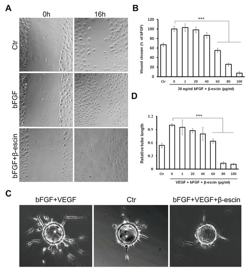Influence of β-escin on bFGF-induced endothelial cells migration. (A) Confluent monolayer of HUVECs was wounded at 0 h. Subsequently, cells were stimulated with 30 ng/mL bFGF in the presence or absence of β-escin at the indicated concentration for 16 h; (B) Effect of β-escin (1–100 µg/mL) on bFGF-induced endothelial cells migration. Values are mean ± SD from 2 cultures in 4 independent experiments (*** p < 0.001 versus bFGF alone); (C) HUVECs exhibit significant reduction of angiogenesis in fibrin gel bead assay after treatment with β-escin (60 µg/mL); (D) Effect of β-escin (1–100 µg/mL) on tube-like vessel formation. The quantification shows reduced sprout lengths. For each experiment, three wells for each condition were quantified. Experiments were repeated three separate times, and representative data are shown. Error bars represent ± SD (*** p < 0.001 versus bFGF alone).