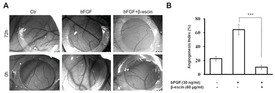 β-Escin reduced capillary formation in vivo. (A) Effect of β-escin on angiogenesis in CAM assay. The CAM models were prepared using 7-day-old chick embryos treated as described in Materials and methods. Sterilized silicone ring was positioned on CAM surface and 30 µL of the sample under test was placed within the ring. After incubation for 72 h, CAMs were photographed with a digital camera. Each group contained five CAMs and the experiment was repeated three times; (B) The results are summarized in the graph as the angiogenesis index (the mean ± SD of new vessel branch points per field) for each experimental variable. Error bars represent ± SD (*** p < 0.001 versus bFGF alone).