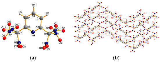 There are currently ongoing efforts to synthesize novel energetic materials with improved performance and decreased sensitivity [1,2,3,4,5,6]. However, these requirements are quite often mutually exclusive, such that the desired combination of high detonation performance with maximum possible chemical stability is a major challenge. Over the last few decades, several strategies for the design of energetic materials that have a high energy content in conjunction with good thermal and mechanical stabilities have been developed [7,8], one of which is to replace benzene rings with nitrogen-containing heterocycles as fundamental components of molecular structures [2,9]. Compared with the benzene ring, nitrogen-containing heterocycles typically possess a greater enthalpy of formation as well as a higher density and more positive oxygen balance [10,11], all of which are desirable characteristics for new energetic compounds. In recent years, the application of azine as a new energetic skeleton has attracted considerable interest, and many polynitro-azine derivatives have been designed and synthesized [12]. However, due to the electron deficient character of the azine ring, it is difficult to perform electrophilic aromatic substitution on the ring, so the introduction of nitro groups into azine rings remains a challenging task in practice.