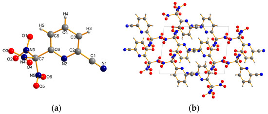Compound 1 crystallizes in the monoclinic space group P21/c with four molecules per unit cell and has a calculated density of 1.692 g·cm−3 at 153 K (Figure 2). The bond lengths and bond angles in the pyridine ring of this compound are in the typical ranges [33], although the C6–N2, C6–N3, and C6–N4 bond lengths in the trinitromethyl group are 1.528, 1.538, and 1.524 Å, respectively, all of which are longer than a standard C–N single bond (1.460 Å) [34]. The C6 atom is in the plane of the pyridine ring and is associated with the torsion angles C1–N1–C5–C6 = −179.47° and C3–C4–C5–C6 = −179.68°. The pyridine ring and three nitro groups are attached to C6 in a tetragonal configuration.