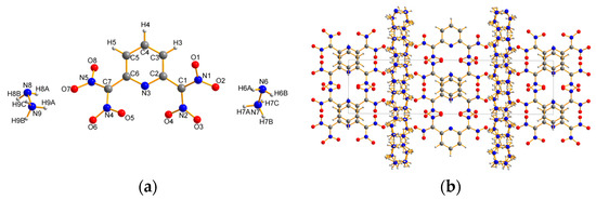 Compound 4 crystallizes in a monoclinic crystal system with space group P21/n and a density of 1.617 g·cm−3 at 153 K (Figure 5). The C–N and C–C bond lengths of the pyridine ring are in the expected ranges. Compared to 1, the C1–C2 bond length (1.484 Å) is slightly shorter. In addition, the C1–N1 and C1–N2 bond lengths of the dinitromethyl group are 1.362 Å and 1.391 Å, respectively, and thus are both much shorter than the analogous bonds in 1 and normal C–N single bonds. This can be explained by the change in the electron density distribution after the removal of a nitro substituent of the trinitromethyl group. Compared with the earlier reported crystal structures of several zwitterionic dinitromethylazine derivatives in which the protonation occurred at one of the nitrogens of the azine ring [35,36], the only nitrogen atom in the pyridine ring was not protonated, while the N2H5+ cation was formed, which was the same situation with the analogical reactions in earlier literature [4,29,30]. Interestingly, the remaining atoms of the dinitromethyl group are inclined to form a plane with the torsion angles O4–N2–C1–N1 = 171.24° and O2–N1–C1–N2 = 3.7°. The two planes defined by the dinitromethyl group and the pyridine ring are almost perpendicular (N3–C2–C1–N2 = 94.53° and C3–C2–C1–N1 = 95.42°).