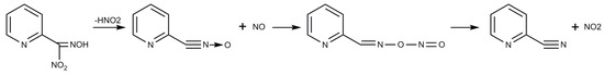 As was stated in the introduction, 2-trinitromethylpyridine (1) was synthesized through the reaction of N2O4 with pyridine-2-carboxaldoxime (Scheme 1). Based on a method reported in literature, a simpler procedure was employed. N2O4 was added into a solution of pyridine-2-carboxaldoxime at room temperature and the purification of products was carried out by column chromatography in a Biotage Isolera One apparatus. The reaction mechanism has been given in the literature earlier (Scheme 2) [25,31]. The preparation of bis(trinitromethyl)-substituted pyridine was somewhat more challenging. Firstly, compared with the preparation of 1, the reaction of pyridine-2,6-dicarboxaldehyde dioxime with N2O4 required a higher reaction temperature (60 °C rather than 40 °C). In addition, X-ray diffraction (XRD) data indicated that the reaction yielded two main products: the desired 2,6-bis(trinitromethyl)pyridine (2) and the byproduct 2-cyano-6-(trinitromethyl)pyridine (3). It was found that increasing the N2O4 concentration (within the range of 0.5‒2.5 mL N2O4/mmol pyridine-2,6-dicarboxaldehyde dioxime) increased the relative proportion of 2 in the product mixture. The formation of the by-product 3 is also explained based on literature reports (Scheme 3) [32]. Firstly, the intermediate nitrolic acid underwent the loss of a molecule of nitrous acid and the nitrile oxide was obtained. In the second step, nitrogen monoxide removed an oxygen atom with the formation of nitrile and nitrogen dioxide.