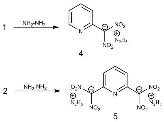 Following the preparation of the above compounds, the ionization of 1 and 2 was attempted. Based on reports, the analogous denitration of trinitromethyl-substituted pyridines using hydrazine was examined in our research. The trinitromethyl-substituted pyridine 1 was first reacted with 80% aqueous hydrazine, and the light yellow hydrazinium salt of 2-dinitromethylpyridine (4) was obtained in high yield (Scheme 4). Subsequently, 2,6-bis(trinitromethyl)pyridine was also successfully converted into the dihydrazinium salt of 2,6-bis(dinitromethyl)pyridine (5). To the best of our knowledge, this is the first report of the preparation of a dihydrazinium salt in this manner.