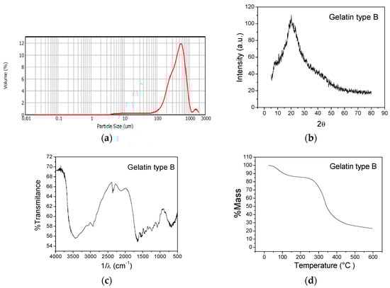 Structural and thermal characterization of type B gelatin. (a) Particle size distribution; (b) X-ray diffractogram; (c) FTIR spectrum; and (d) TGA thermogram.