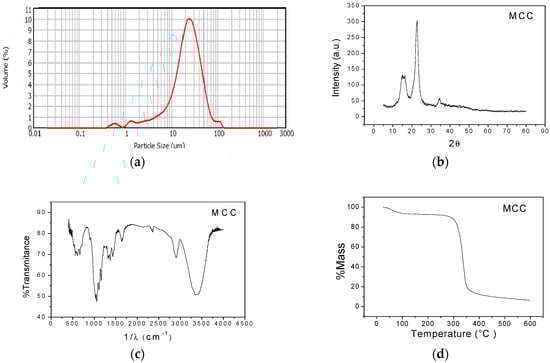 Structural and thermal characterization of MCC. (a) Particle size distribution; (b) X-ray diffractogram; (c) FTIR spectrum; and (d) TGA thermogram.