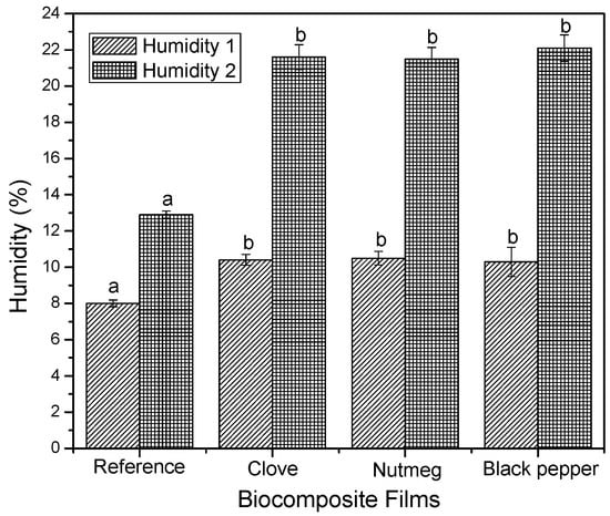 Figure 3 presents the humidity of films after drying (Humidity 1) and after the conditioning period (Humidity 2). The humidity content of the biocomposite films containing oleoresins did not have significant differences after drying, obtaining humidity values of 10.4 ± 0.1 g of water/100 g of biocomposite film. After conditioning, the films increased their humidity content to 21.73 ± 0.32 g of water/100 g of biocomposite film. Additionally, the reference films (biocomposites without added oleoresin) had humidity contents of 8 ± 0.18 g of water/100 g of biocomposed film after drying and 12.9 ± 0.19 g of water/100 g of biocomposite film upon completing the conditioning period. The reference films had low humidity after drying and after conditioning with respect to the biocomposite films with oleoresins presenting significant differences (p < 0.05), which indicates that oleoresins would be creating bonds with the OH groups of the plasticizer and its polyphenolic groups, thus, maintaining the structure hydrated [45].