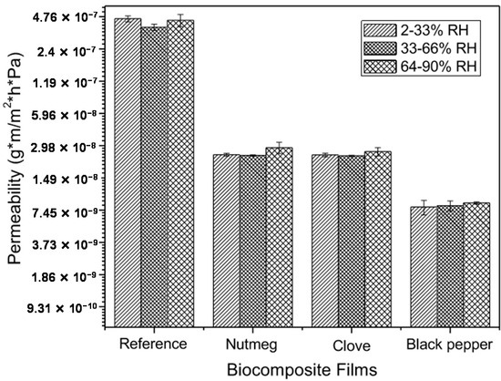 Upon adding nutmeg, clove, and black pepper oleoresins to the gelatin matrix, microcrystalline cellulose and glycerol (reference film), the permeability gradient diminished significantly, from 4 × 10−7 g·m/m2·h·Pa to 4 × 10−9 g·m/m2·h·Pa (Figure 4). Likewise, upon varying the relative humidity, slight permeability changes were observed among the same films. This permeability decrease with respect to reference films is due to the hydrophobic nature of the oleoresins, which avoids absorption and desorption of water molecules, increasing film hydrophobicity due to the interactions between the hydrophobic compounds in oleoresins and the other film components, which diminishes the availability of the hydrophilic groups. The water molecules diffuse into the continuous polymer phase, where the presence of oily molecules introduces interruptions that increase the tortuosity for transference or mobility of water molecules [46].