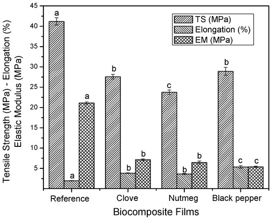 Mechanical properties of biocomposite films with oleoresins and reference. Different letters in the same column indicate significant differences (p < 0.05).