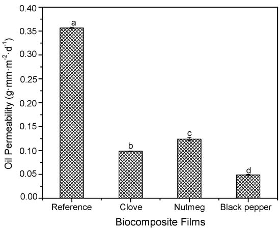 As shown in Figure 6, oil permeability values of biocomposite films containing oleoresins (clove, nutmeg or black pepper) were between 25% and 30%, smaller in comparison with the reference film (0.36 ± 0.0017 g·mm·m−2·d−1). This result may be due to a greater final humidity content in films containinig oleoresin (Section 3.2.1) increased the total number of hydroxyl groups (oleophobic) in the film network, which could prevent the passage of oil molecules through the film as reported by [22,51]. Oil permeability values varied significantly in function of the differences in oleoresin composition.