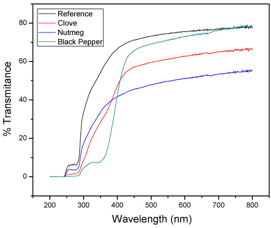 Light transmission of biocomposite films with clove, nutmeg, and black pepper oleoresins and reference (without oleoresin).
