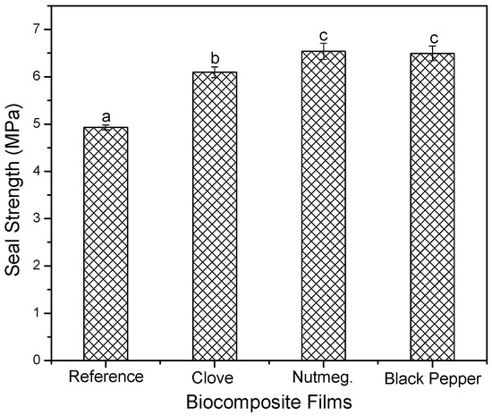 Seal strength of biocomposite films with oleoresins and reference. Different letters in the same column indicate significant differences (p < 0.05).