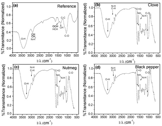 In the IR spectrum obtained for the reference films (Figure 10a), it can be noted that the band at 3422 cm−1 has OH and N-H groups characteristic of glycerol and gelatin (type A amide), respectively. At 2887 cm−1, there are CH and CH2 groups; the band at 1428 cm−1 has the HCH groups and OCH vibrations; the band at 1347 cm−1 is related to the vibration of CH groups; the band at 1219 cm−1 is attributed to C-C groups; and at 1045 cm−1 to C-O group stretching. Most of the functional groups coincide with that reported for microcrystalline cellulose and gelatin. The spectra in Figure 10b–d corresponding to films with clove, nutmeg, and black pepper oleoresins, respectively, were quite similar amongst themselves, but different from the reference film.