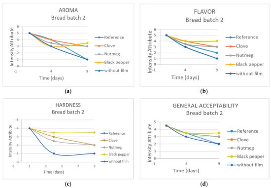 Evolution of sensory attributes during nine days of storage (25 °C and 75% RH) of bread packaged in biocomposite films. (a) Aroma; (b) flavor; (c) hardness; (d) general acceptability.