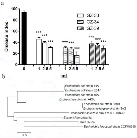 2.2. E. coli GZ-34 Shows Effective Protection to Tomato from R. solanacearum Infection