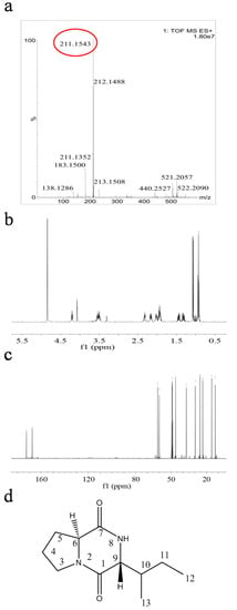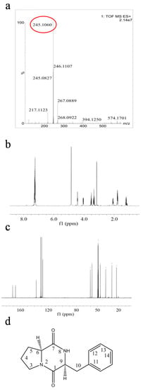 - Nishanth, K.S.; Mohandas, C.; Siji, J.V.; Rajasekharan, K.N.; Nambisan, B. Identification of antimicrobial compound, diketopiperazines, from a Bacillus sp. N strain associated with a rhabditid entomopathogenic nematode against major plant pathogenic fungi. J. Appl. Microbiol. 2012, 113, 914–924. [Google Scholar] [CrossRef] [PubMed]