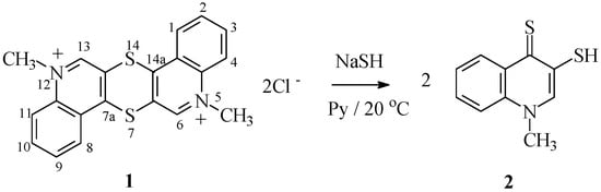 5,12-Dialkylthioquintrenediinium bis-salts 1 were obtained by alkylating thioquinantrene (1,4-dithiino[2,3-c,5,6-c′]diquinoline) [24]. The previously described reaction of thioquinantrene ring opening requires gaseous hydrogen sulfide. The novel method described herein based on using sodium hydrosulfide is safer, less cumbersome, and does not require disposition of excess hydrogen sulfide. Reactions of salts 1 with sodium hydrosulfide in pyridine solution at room temperature occur with complete consumption of salts 1. The reaction occurs by nucleophilic attack of hydrosulfide anion on aza-activated positions 7a and 14a of salts 1, which leads to the opening of the 1,4-dithiin ring of salts 1. As the result of this reaction, two molecules of 1-methyl-3-mercaptoquinoline-4(1H)-thione 2 are formed (Scheme 1). This compound was obtained previously via reaction of salt 1 with hydrogen sulfide [27], but its structure has not been confirmed spectroscopically.