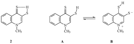 Use of sodium hydrosulfide increases the speed of compound 1 dithiine ring cleavage. This is the result of the stronger nucleophilic properties of hydrosulfide anion as compared to the hydrogen sulfide molecule. The perquisite of reaction with hydrogen sulfide has been the use of pyridine as solvent (proton acceptor). Reaction with NaSH does not require the presence of a proton acceptor (it also proceeds in other solvents, e.g., ethanol, albeit much more slowly). The reaction products are easily soluble in pyridine. 1H-NMR spectrum of compound 2 in CDCl3 solution lacks a signal from thiol proton, which may be the result of its interaction with thiocarbonyl sulfur atom (C=S) in 4-quinoline position (Scheme 2). This is corroborated by the 13C-NMR spectrum of compound 2, in which C4quinolinyl signal occurs at δ = 134.64 ppm. The signal from thiocarbonyl carbon in 13C-NMR spectrum should be present above 180 ppm [28]. It appears that the hydrogen bond does not much affect the IR spectrum of this type of compound. A strong band corresponding to C=S stretching vibrations in compound 2 occurs at 1107 cm−1, whereas for compound 3a, which lacks such interactions, the band is present at 1112 cm−1. The elemental composition of compound 2 is confirmed by MS spectrum and the results of elemental analysis.