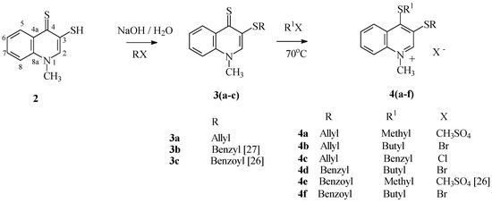 Reactions of 2 in aqueous sodium hydroxide with alkylating or acylating agents (allyl chloride, benzyl chloride and benzoyl chloride) occurred, as expected, on 3-quinoline thiolate sulfur, and led to their respective 1-methyl-3-thioquinoline-4(1H)-thione derivatives 3 with 73%–83% yield. The 13C-NMR spectra for compounds 3 show signal from the C4quinolinyl carbon occurring in the characteristic range for thiocarbonyl carbon, and this additionally confirms the structure of 2, the substrate of these reactions. Alkylating of thione function in the 4-quinoline position of compound 3 was carried out at 70 °C, using excess of alkylating agents (dimethyl sulfate, butyl bromide or benzyl chloride) as reaction milieu (Scheme 3). The reactions led to the respective quinoline salts 4 with quantitative yield.