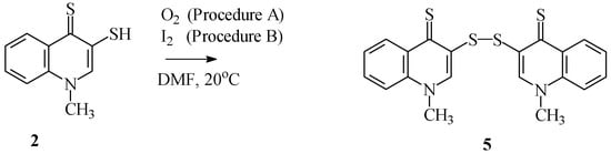 1-Methyl-3-mercaptoquinoline-4(1H)-thione 2 in substance is stable, whereas in solution the thiol function is easily oxidized. Compounds 2 were transformed into di(1-methylquinoline-4(1H)-thione-3-yl) disulfide 5 by reacting (2) in DMF with atmospheric oxygen or ethanolic iodine (Scheme 4). Both procedures gave disulfide 5 with quantitative yield.