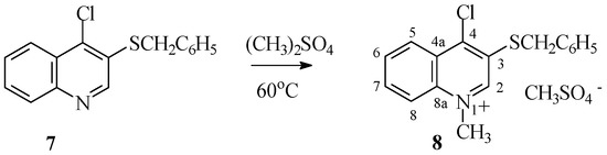 Salt 8 with chlorine atoms instead of thioalkyl groups in the 4-quinoline position was obtained by N-alkylating 4-chloro-3-thiobenzylquinoline 7 derivatives using dimethyl sulfate (Scheme 6). The reaction proceeds easily at 60 °C, leading to salts 8 with quantitative yield.