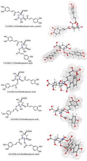Structures (left) and preferential conformation-based ball-stick models (right) of five di-O-caffeoylquinic acids (di-COQs). The ball-stick models were created in Chem3D Pro 14.0. The screenshots from models are from the same perspective; i.e., C-1 was deposited on the right end, and –COOH is upward. The three-dimensional perspective animations are shown in Video S1–5. However, the relative degree of crowd for caffeoyl moieties remains unchanged.
