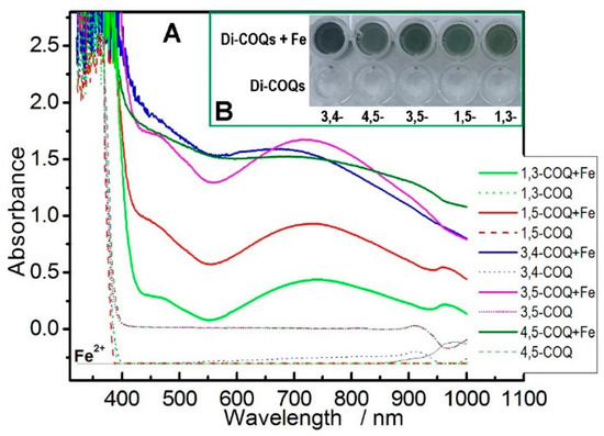 (A) UV-Vis spectra of the five di-COQs and their chelating products with excess Fe2+. (B) The colors of complexes, resulting from the product mixtures, were taken by a camera.