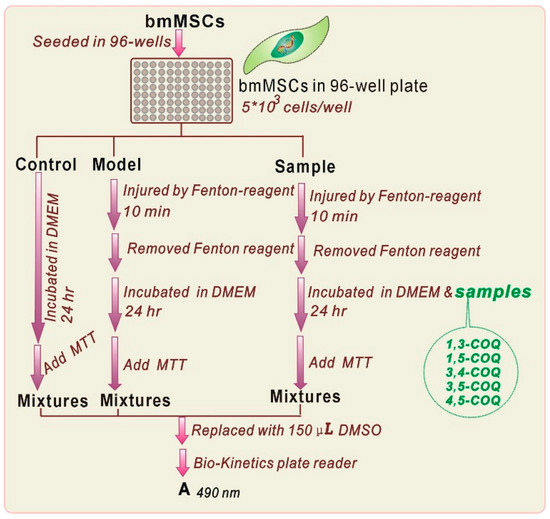 The MTT assay was used to evaluate cytoprotective effect of di-COQs towards bmMSCs [34,36,37]. The experimental protocol is briefly illustrated in Figure 4.