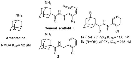 For this, we envisaged the aminoadamantylcarbohydrazides of general structure I as putative dual inhibitors (Figure 1). Firstly, I features the amantadine scaffold, which is known to be a micromolar NMDAR antagonist (IC50 = 92 ± 29 μM) []; secondly, the N’-arylcarbohydrazide moiety of 1a is a compound endowed with nanomolar P2X7R antagonist activity (IC50 = 11.6 ± 2 nM) []. Taking into account the fact that the introduction of a polar alcohol group in 1a led to a reduction of the antagonist activity of P2X7R (IC50 = 275 ± 50 nM for 1b) [], we speculated that the compounds of general structure I might display low micromolar to high nanomolar P2X7R antagonist activities, thus suiting our aim of designing the first dual NMDAR–P2X7R antagonist with low micromolar activities in both targets.