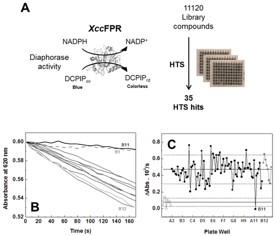 We then designed an NADPH-dependent DCPIP-diaphorase activity based HTS assay for the discovery of molecules inhibiting XccFPR using 96-well plates and the Prestwick (14 plates, 80 compounds/plate) and Maybridge (125 plates, 80 compounds/plate) libraries of compounds (Figure 2). As detailed in the Methods section, each HTS 96-well plate assay had the following: (i) in all wells of Column 1 all reactants but no enzyme or chemical from the library (negative controls); (ii) in all wells of Column 12 all reactants and enzyme (positive controls); and (iii) in wells from Columns 2–11 all the reactants, the enzyme and each of the compounds of a plate of the screening library. The reaction was followed by determining the rates for DCPIP reduction by XccFPR in each one of the wells, as indicated in the Methods section (Figure 2B shows reaction rates for the data of a row, including controls, of one of the 96-well assay plates). All wells producing reaction rates lower than 90% of the positive controls’ average activity were preselected as potentially containing compounds that can be inhibitors of the XccFPR diaphorase activity (Figure 2C shows the detail of this analysis for the 96 wells of one assay plate).