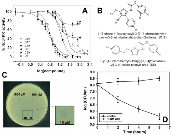 Best performing inhibitors. (A) Dose-response curves for the XccFPR 2,6-dichlorophenolindophenol (DCPIP)-diaphorase activity in the presence of representative hits. Values derived from these representations are included in Table 1 and Table 2. Experiments performed at 25 °C in a mixture containing 20 nM XccFPR, 95 µM DCPIP and 50 μM NADPH in 50 mM Tris/HCl pH 8.0 (n > 3, mean ± SD). (B) Chemical structures of C12 and D5. (C) Xcc growth inhibition in SB-agar plates with different concentrations (1000, 100 and 10 µM) of C12. The zones of growth inhibition were photographed after incubation for 24 h at 28 °C. (D) Liquid SB growth in the presence of 1 mM C12. Xcc culture was cultivated aerobically in SB medium at 28 °C with shaking at 200 r.p.m. Aliquots were taken at the indicated times and measured for colony-forming capacity on SB-agar plates (n > 3, mean ± SD). Control: 2% DMSO.