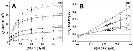 Mechanisms of the D5 XccFPR inhibitors. (A) Michaelis-Menten plots and (B) Lineaweaver-Burk representations with global fit for non-competitive inhibition. Reaction rates were measured in 50 mM Tris/HCl pH 8.0 containing 20 nM XccFPR, 95 µM DCPIP and 0–50 μM NADPH at 25 °C (n = 3, means ± SD). All samples contained 2% DMSO.