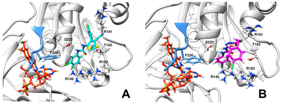 These data suggest that the chloro-phenyl-urea moiety is the key scaffold for the inhibitory activity of C12 and D5 on XccFPR. This functional group’s arrangement docks in a cavity formed at the confluence of the proposed binding site for the NADP+ coenzyme pyrophosphate bridge, the characteristic C-terminal extension found in FPRs (255-AFVEK-259 in XccFPR) and the adenine moiety of FAD (as a consequence of its bent conformation in FPRs) (Figure 6). Because of the C-terminus being shorter in plastidic enzymes and of their FAD showing an extended conformation that leaves its adenine moiety far from the C-terminal, such C12 and D5 binding cavity does not appear to be similarly formed in FNRs (Figure 1). In fact, the theoretical docking of C12 and D5 to AnFNR does not find representative clusters in the NADP+ binding region (Figure 6D), showing them preference for the FAD-binding domain of the protein. Thus, binding of C12 and D5 near the C-terminal extension of XccFPR has a deleterious effect on the conformational rearrangement proposed for this region of bacterial FPRs as a requirement to achieve a catalytically competent interaction by stacking the nicotinamide ring of the NADPH hydride donor with the isoalloxazine of the FAD acceptor. Therefore, our docking structural information allows the presence of C12 and D5 not only competing with binding of the pyrophosphate moiety of NADPH in XccFPR, but also preventing rearrangements at the catalytic site for productive nicotinamide binding.