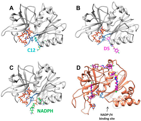 Binding pockets of selected ligands in the overall protein structure. (A) Model for the best docking pose of XccFPR:C12 after MD refinement. (B) Model for the best docking pose of XccFPR:D5 after MD refinement. (C) Theoretical binding of the NADPH substrate (based in PDB 4b4d for the protein and PDB 2vnj for the NADP+ conformation as found in RcFPR). (D) Four best docking clusters of AnFNR:D5. XccFPR and AnFNR are shown as grey and light salmon cartoons respectively. FAD, C12, D5 and NADPH are shown in CPK colored sticks with carbons in orange, light blue, pink and green respectively. The C-terminal extension of XccFPR and the C-terminal residue in AnFNR are colored in blue.