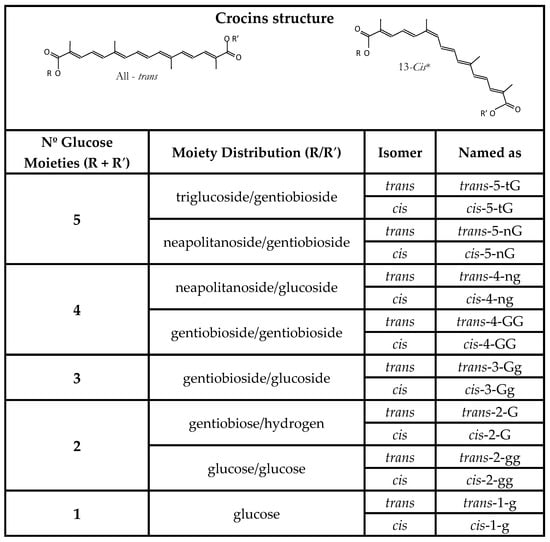 Simplified name of the glycosidic esters, crocins, of the carotenoid crocetin introduced by Carmona and coworkers []. Meaning of the abbreviations: t is triglucose; G is gentiobiose; n is neapolitanose; g is glucose.