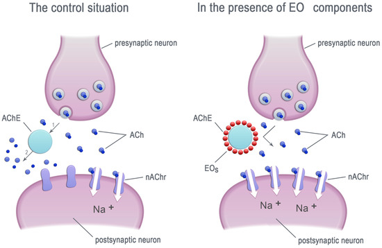 The EO components inhibit the acetylcholinesterase (AChE) activity. ACh—acetylcholinesterase, nAChr—nicotinic acetylcholine receptors, EOs—essential oil components.
