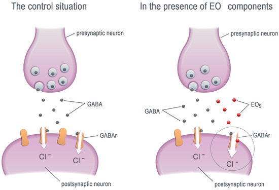 The EO components increase the chloride current by allosteric modulation of the GABA receptors. GABA—γ-aminobutyric acid, GABAr—GABA receptors, EOs—essential oil components.