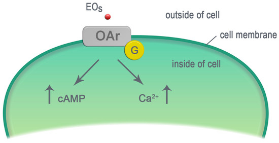 The EO components activate the octopamine receptors. EOs—essential oil components, OAr—octopamine receptor, G—protein G, cAMP—cyclic adenosine monophosphate, Ca2+—calcium ions, ↑—increase in the molecule level.
