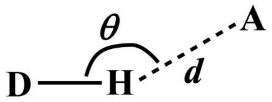Note that DANAI does not contain local geometrical information such as the spatial and orientation arrangement of atoms. Rather, such information is pre-defined as criteria by the users for the software to identify the atomic interactions as described according to the DANAI expression. In other words, an interaction is identified based on a given set of critical values. For instance, in the case of HB, the H-acceptor distance (d) and the angular orientation (θ) must be specified, as illustrated in Figure 2. DL_ANALYSER will then use these critical values to determine quantitatively the presence of such interactions.