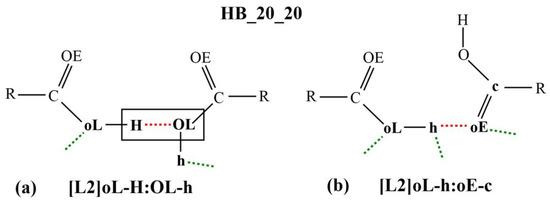 Figure 3a,b shows two examples of the micro-interactions. Many more examples are shown in the Supplementary Materials. According to the DL_F Notation, the atomic species that are involved in the DANAI micro-interaction expression consist of the carbonyl group, C20 and O20E, and the hydroxyl group, O20L and H20O. Since only the carboxylic groups are involved in the HB interactions, the atomic species can be abbreviated as C, OE, OL and H, respectively; or c, oE, oL and H, respectively, depending on the identification criteria for the number of HB.