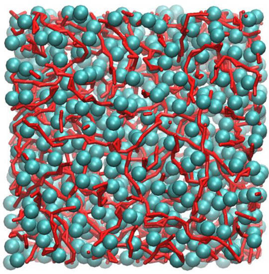 Figure 4 shows an instantaneous snapshot of the molecular configuration at time = 4.44 ns. All methyl carbon atoms that are in nearest contact with at least one other neighbour are shown as cyan spheres. The carboxylic groups that participate in HB are represented as red streaks. For clarity purposes, the alkyl hydrogen atoms are not shown. In this particular snapshot, there are four methyl carbon atoms that did not participate in close HP contact with any other methyl groups and three carboxylic groups that did not participate in HB interactions. These are not shown in Figure 4.