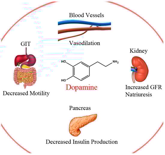 Dopamine (DA) is a natural neurotransmitter and neurohormone that exerts its action by binding to five DA receptors in the brain, D1–5 [1]. DA production represents the first steps in catecholamine synthesis and starts with phenylalanine which is hydroxylated to tyrosine, then again to levodopa (LD) and finally, through decarboxylation, to DA (Scheme 1). This cascade is accomplished and catalysed with the aid of three enzymes. The rate limiting enzyme is tyrosine hydroxylase. This can be inhibited by catecholamine neurotransmitters through negative feedback to keep proper regulation of DA [2]. DA plays several and variant roles in the body systems; including central nervous system (CNS), circulatory, renal, digestive and immune systems (Figure 1). Its role in the CNS is a cornerstone in controlling movement and emotion [1].