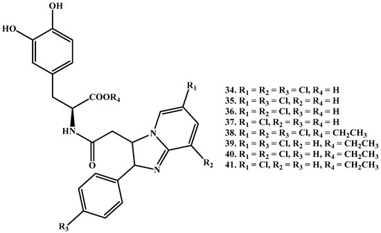 Denora et al. [59] proposed a series of novel amide LD prodrugs (Figure 6, 34–41), called Dopimid compounds. The series have high BBB penetrating potential due to substituted 2-phenyl-imidazopyridine-3-acetic acid. Of these Dopimid compounds, 34, 35, 38 and 39 were found to be stable against chemical hydrolysis, although they showed faster breakdown in diluted rat serum at 37 °C, and were able to penetrate the CNS. Moreover, a dose- and time-dependent elevation of DA levels in rat medial prefrontal cortex after intraperitoneal administration of compounds 38 and 39 was obtained. Similar results were also obtained by Eltayb et al. after i.p. administration of LD [60].